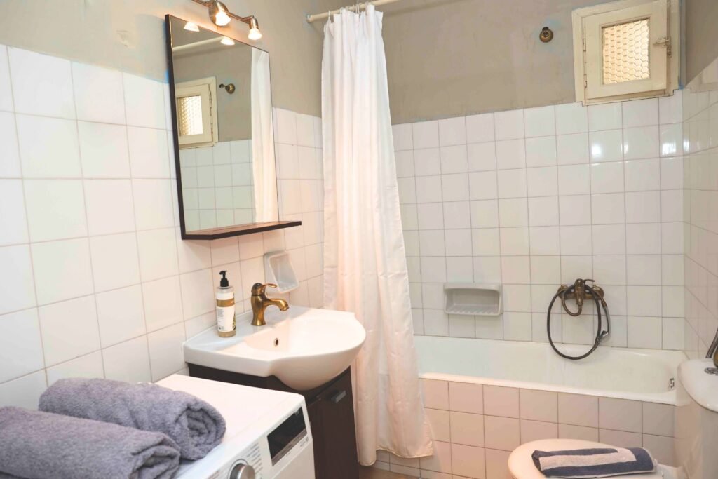 The bathroom of Als Plomari features a bathtub with a shower, a toilet, a wash basin with a mirror and a washing machine for your clothes. An electric boiler to heat the water is also available. There is no need to bring your towels, since we provide you body and face towels, as well as towels for the beach. A hair-dryer is also available as was well as luxury shampoo/conditioner and liquid hand-soap. Choose Als Plomari is a great choice if you are looking for a vacation rental in Plomari.